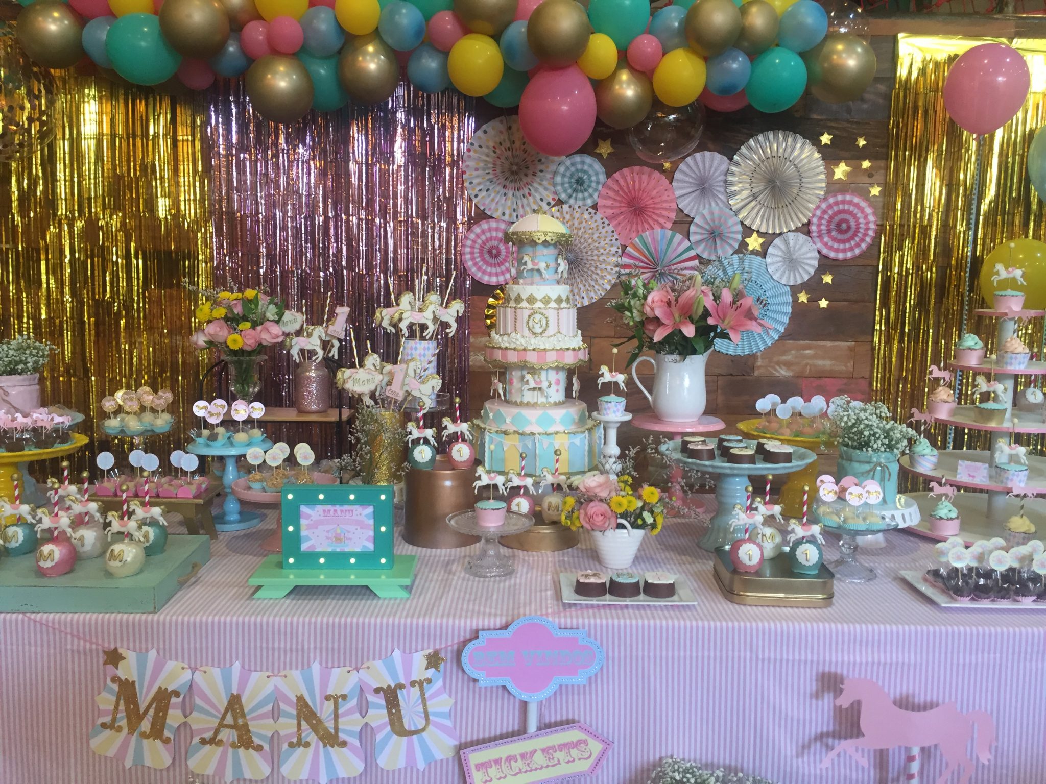 A Amanda escolheu Carrossel para ser o tema do primeiro aninho da Manu, sendo as cores principais o rosa e o dourado! A Manu é nossa clientinha antes mesmo de nascer, pois fizemos o chá de bebê dela! Muito carinho por este projeto: desde os detalhes do convite, o bolo de 4 andares incrivelmente bem executado pela parceira Elaine Russo, o painel de franjas, rosetas e balões desconstruídos…